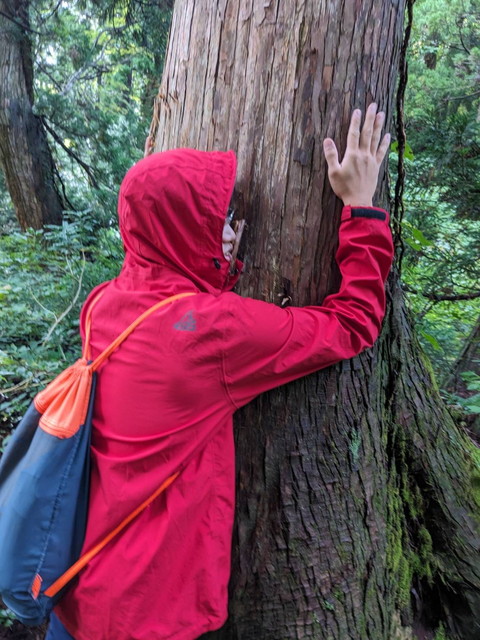 あと、長期休暇には大学や研究所が実習プログラムを組んでいることも多いです。琉球大学が実施したサンゴ礁実習や新潟大学の佐渡実習に参加し、知識や経験を得ることにつながりました。サンゴ礁実習でのウミヘビとの遭遇と、スギに抱き着く私の写真をご覧ください。