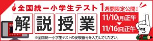 ピックアップ 全国統一中学生テスト・小学生テスト解説授業のお知らせ2025/11/10 全国統一中学生テストの解説授業が東進のHPで受講できます! 全員必ず受講しましょう! ↑クリック 全国統一小学生テストの解説授業が四谷大塚のHPにて受講できます! まずは1教科からでも必ずやってみよう! ↑クリック (期間限定ですので、早目に受講しよう!) 前の記事 ピックアップ
